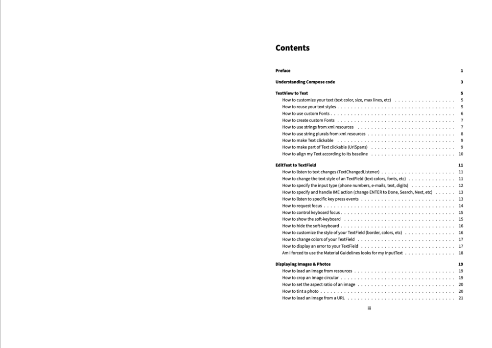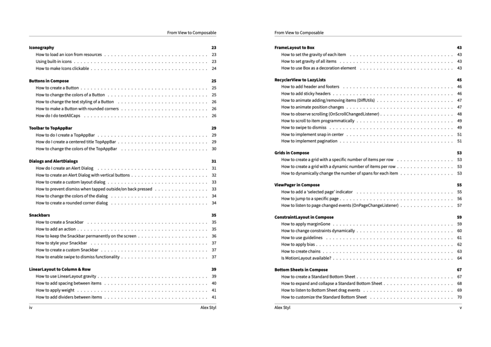 Don't learn Jetpack Compose from scratch. From View to Composable includes code snippets and on-to-the-point explanation on how to do everything you already know from Android Views using Jetpack Compose.